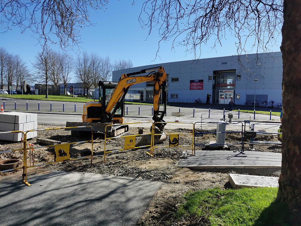 Sous maîtrise d'ouvrage de Brest métropole, des quais de bus sont en cours de création des deux côtés de la rue de Kergoat, en face de la faculté de Droit, Économie, Gestion et AES.