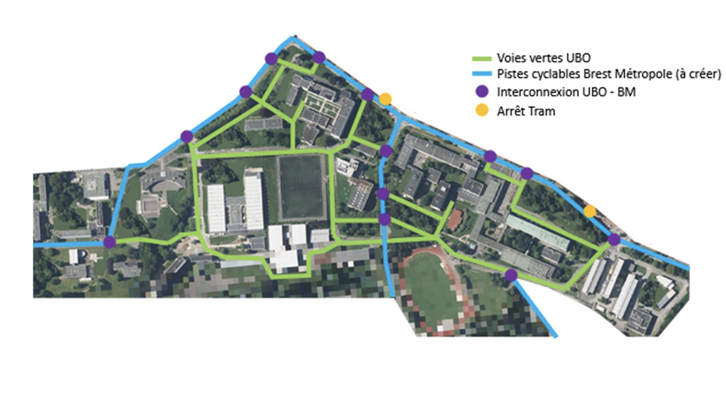 Écomobilité UBO, forte de sa communauté mixte d'utilisateurs étudiants et personnels, participe aux politiques de l'université en faveur des mobilités douces : implantation des abris vélos, cheminements cyclables, achat de flottes de vélos.